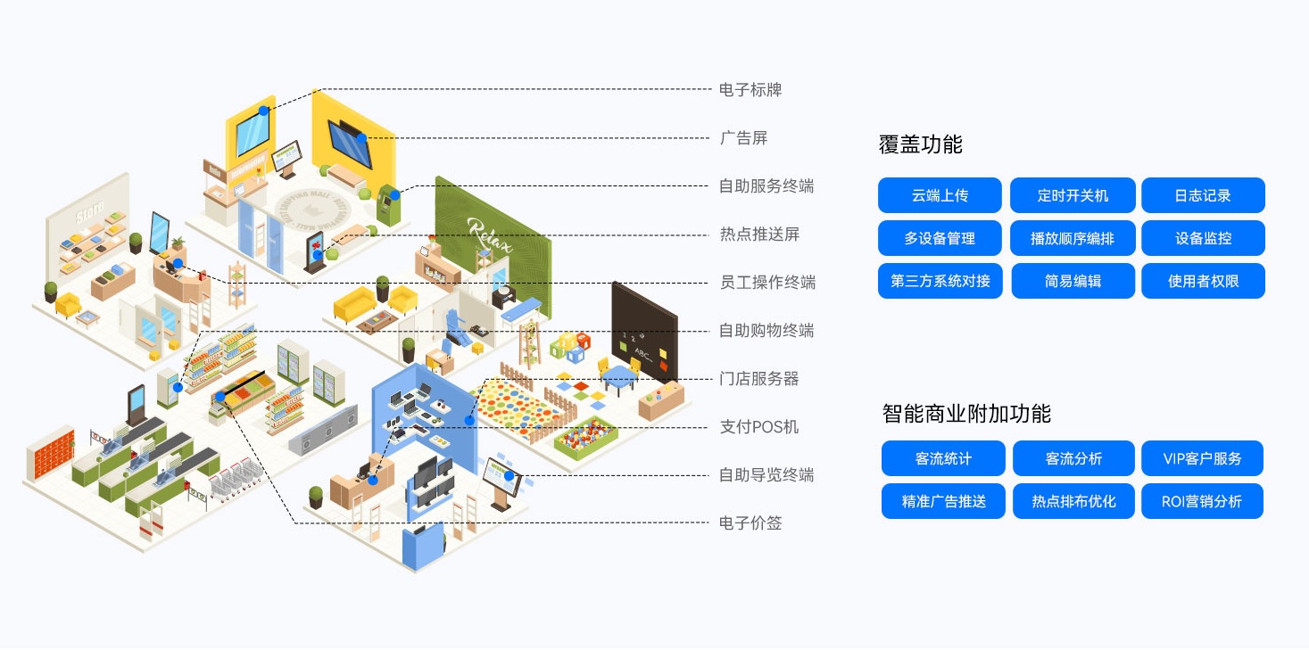 米兰milan智慧零售解决方案搭配米兰milanGDSM-ES智能零售管理系统,为全球零售门店客户提供了功能齐全的数字化运营管理工具,提供广告显示信息编辑、信息发布、AI识别、客户分析和会员管理等功能,实现对设备、内容、营销、运营的综合数智化管理能力,为精准运营管理赋能。