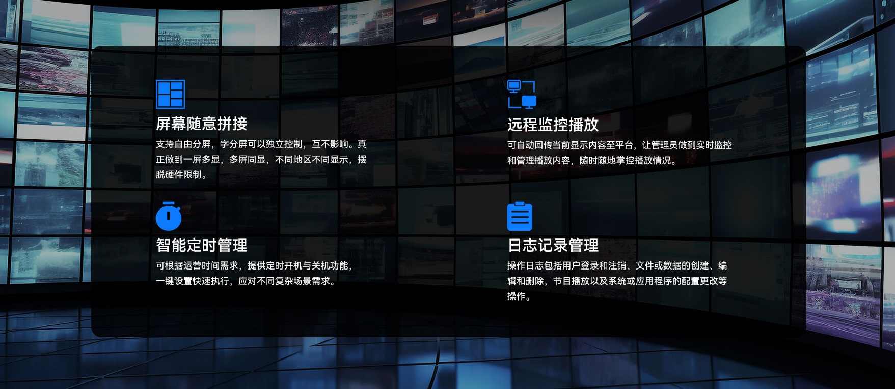 米兰milanGDSM-ES智能零售管理系统可 实现多屏拼接/多屏分离自由选择,也可画中画显示,用户可根据场景自行灵活安排,更可以异形屏幕显示安排,让广告显示更加丰富多彩。同时,还可以轻松查看设备的基本信息,如连接状态、播放状态、播放到期时间,屏幕类型等;可对设备进行分组远程管理,远程设置定时开关机时间,控制设备音量,远程重启、远程升级,远程截屏查看实时画面等,实现屏幕智能管理。