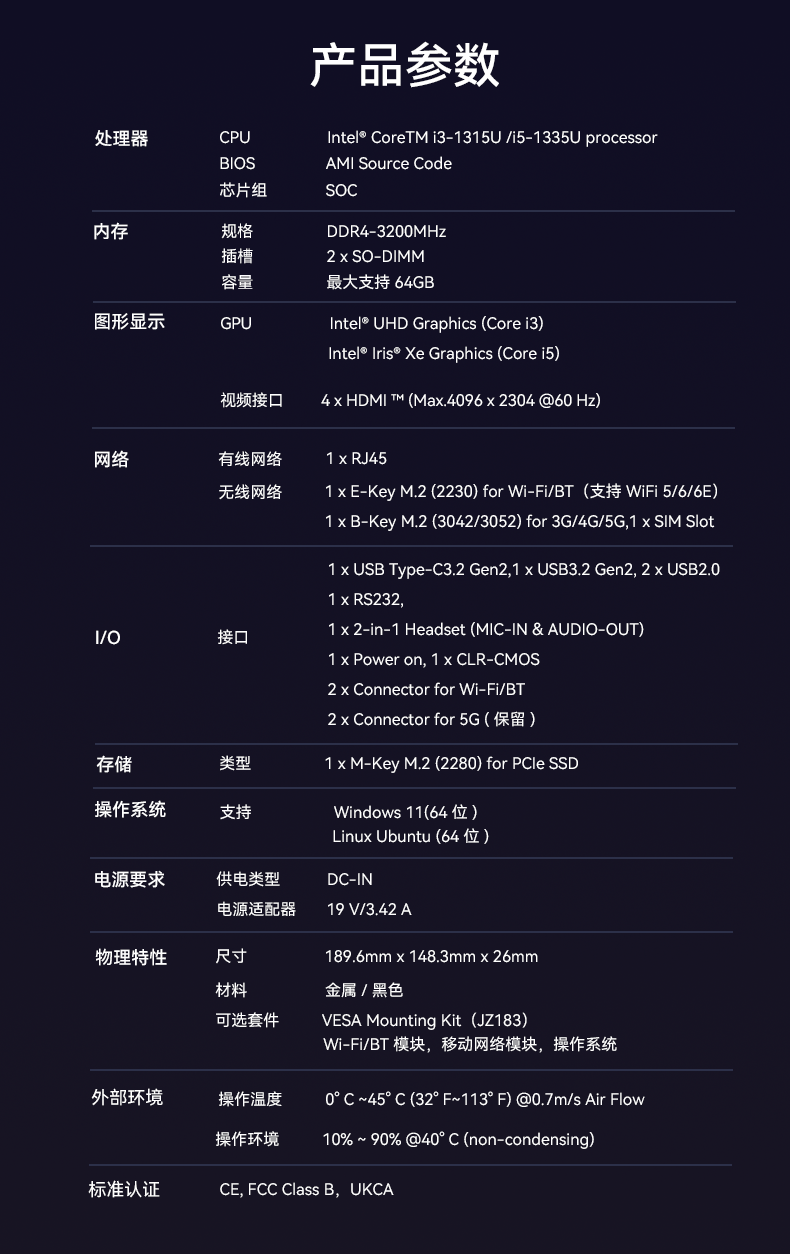 米兰milan科技D613采用英特尔Raptor Lake酷睿i3-1315U/i5-1335U 处理器,作为一款性能强悍的主机,它的TDP仅15W,能有效降低能耗,延长电池寿命。在内存方面,D613采用2 x SO-DIMM DDR4-3200 MHz,最大可达64GB,并配备1 x M-Key M.2 (2280) for PCIe SSD。