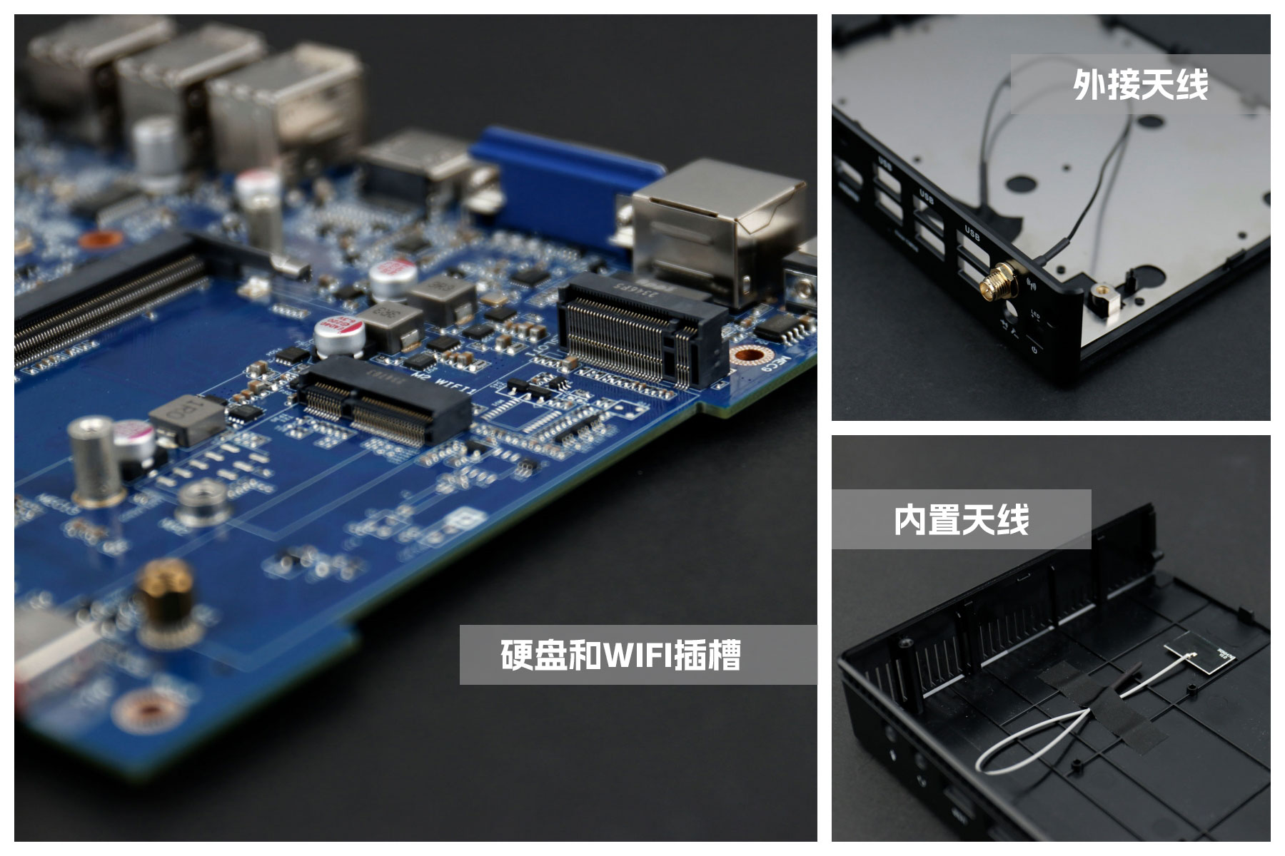 米兰milan桌面云终端Y-BOX S2主板上配备了 1个 M.2 固态硬盘位,接口规格为 PCIe3.0 标准,匹配标准的 2280 规格硬盘。一侧还有一个M.2接口,匹配2230长度的WIFI/BT模块插槽,WiFi模块可以连接的是外接天线,增强信号,同时也可以内接天线,灵活应用,支持Wi-Fi 5/6/6E网络。