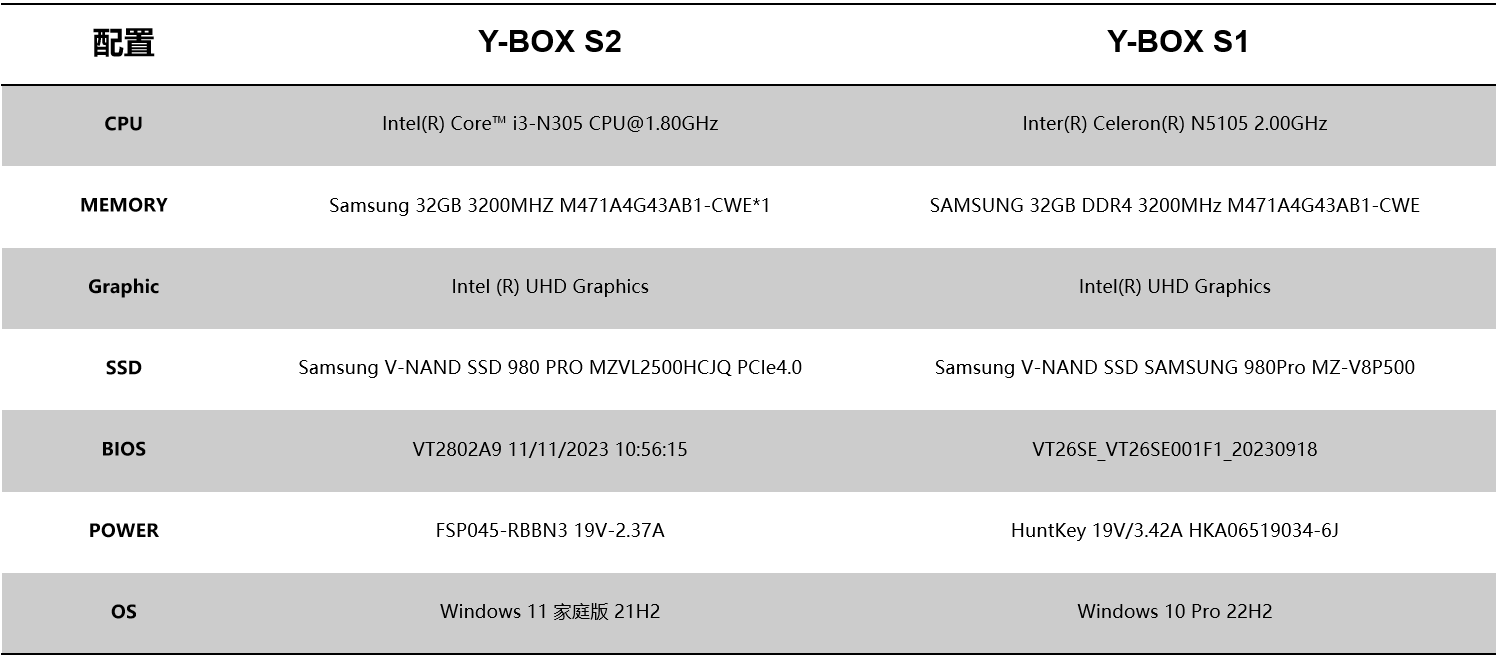 针对桌面云终端Y-BOX S2的测试项目中,最值得关注的是性能测试的跑分数据和稳定性测试内容,这能直观影响主机在使用过程中的稳定性和用户的使用体验。针对性能测试,米兰milan选择了将Y-BOX S2与前一款更迭产品Y-BOX S1进行对比分析,Y-BOX S2支持Intel® Alder lake-N处理器,Y-BOX S1支持Intel® Jasper Lake,并分别选取了以下配置: