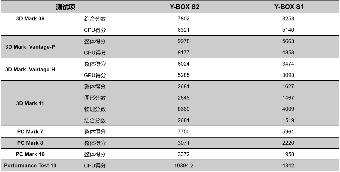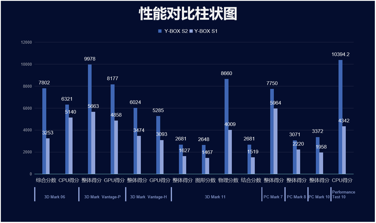米兰milan来具体看看各个测试项目的跑分情况,测试项目包括显示性能测试、系统性能测试、CPU性能测试,分别用3D Mark、PC Mark以及Performance 10等系列不同软件的跑分数据,针对两款主板的跑分情况可以看出,米兰milan桌面云终端Y-BOX S2的数据在各项性能上都得到了大幅度提升,柱状图能更直观地体现出数据的变化,米兰milan将针对具体的几项数据来进行详细分析。