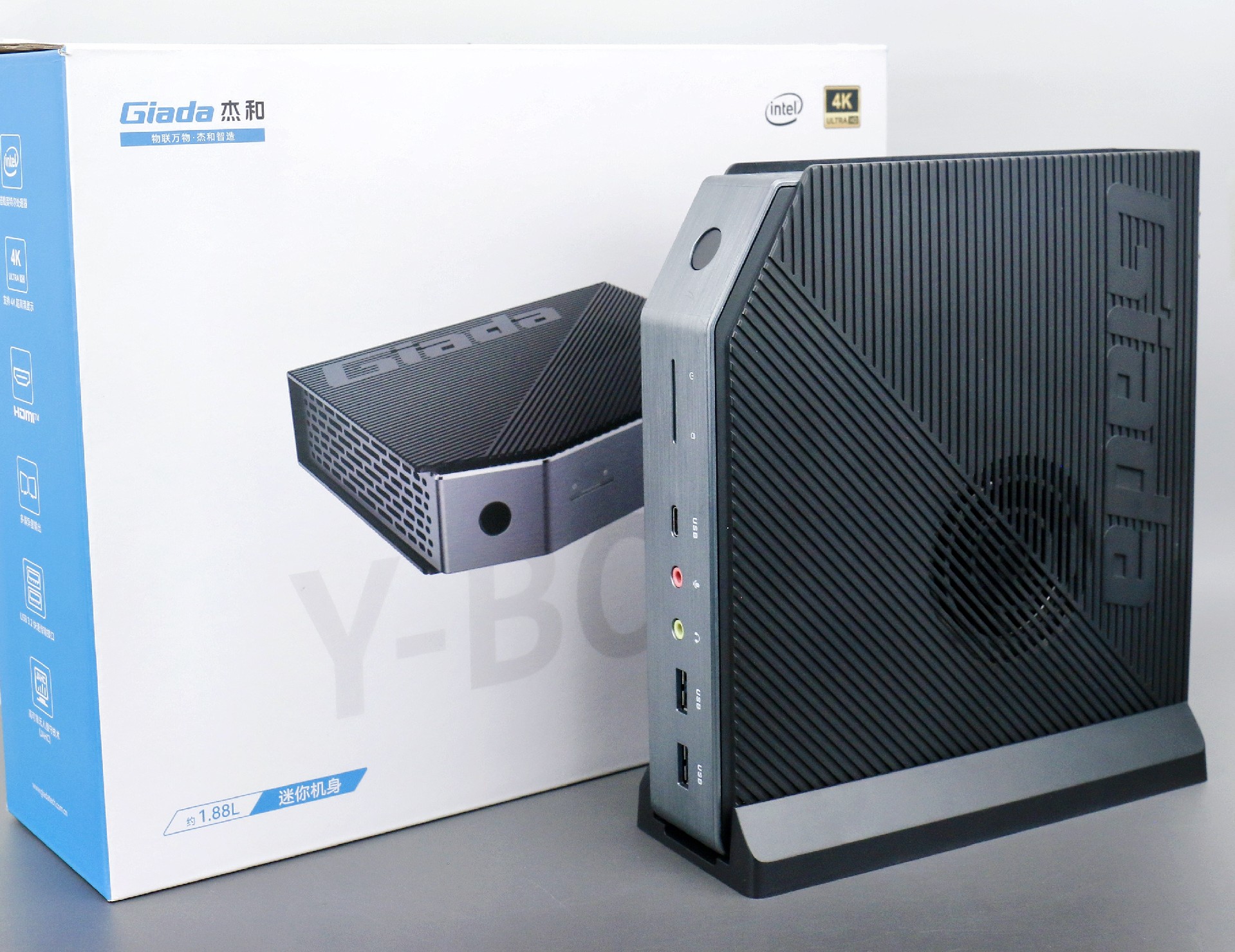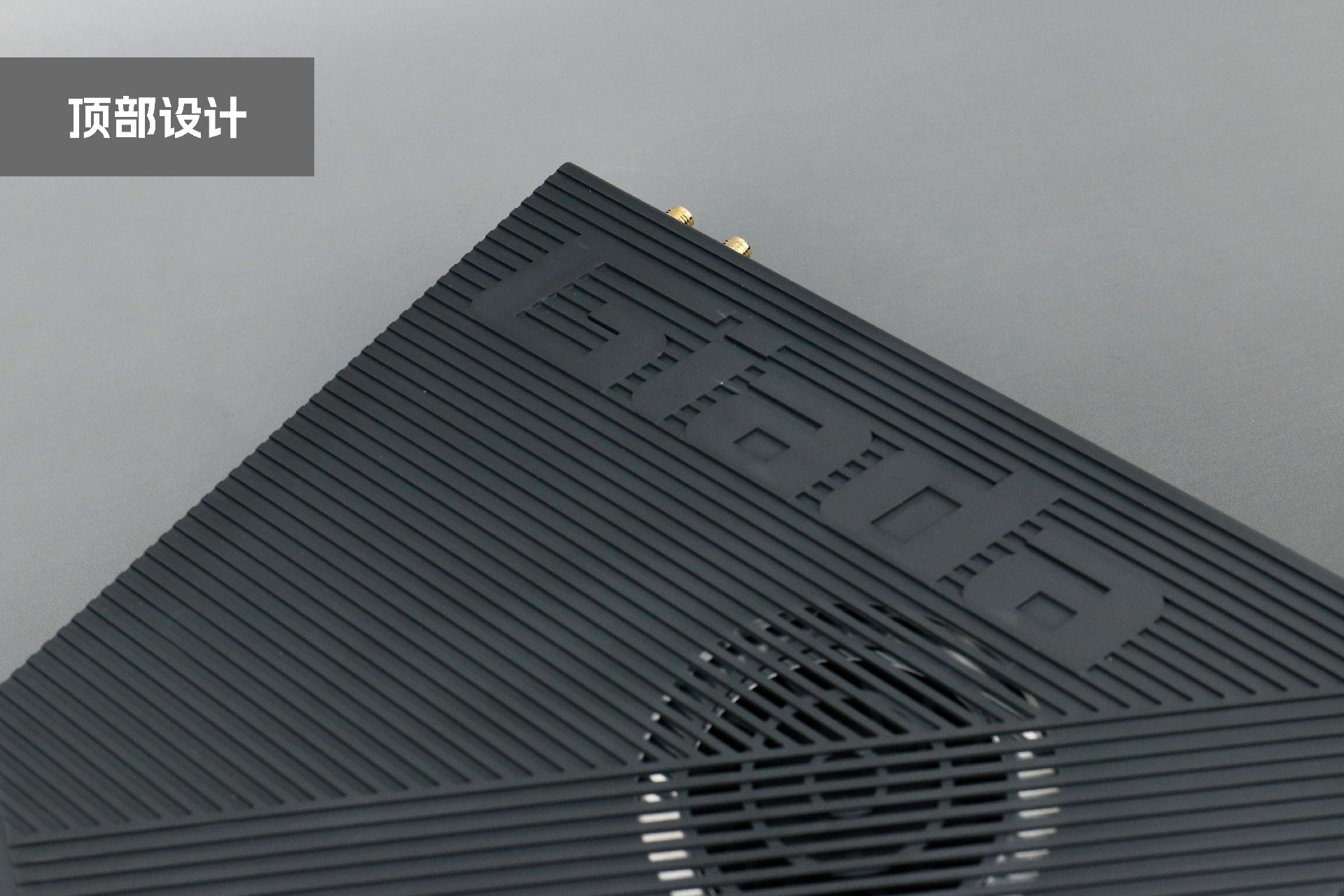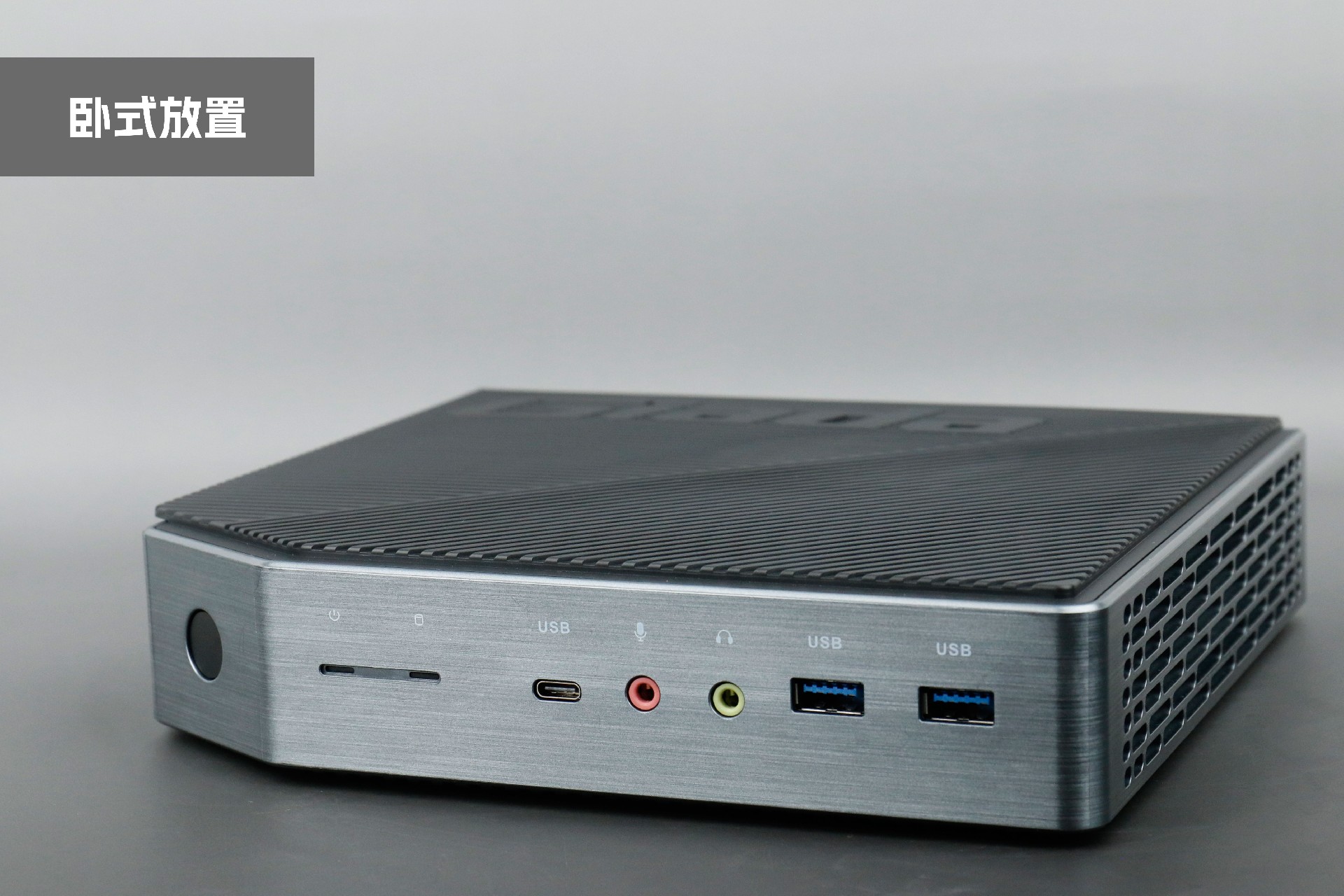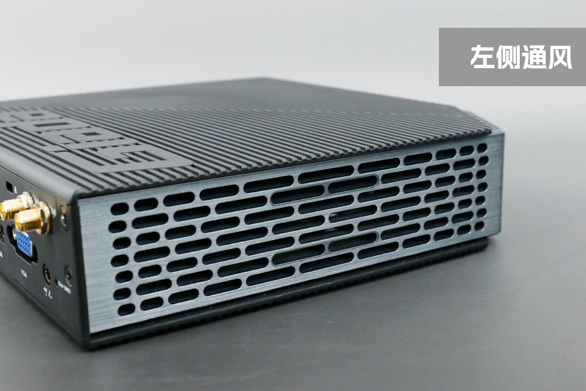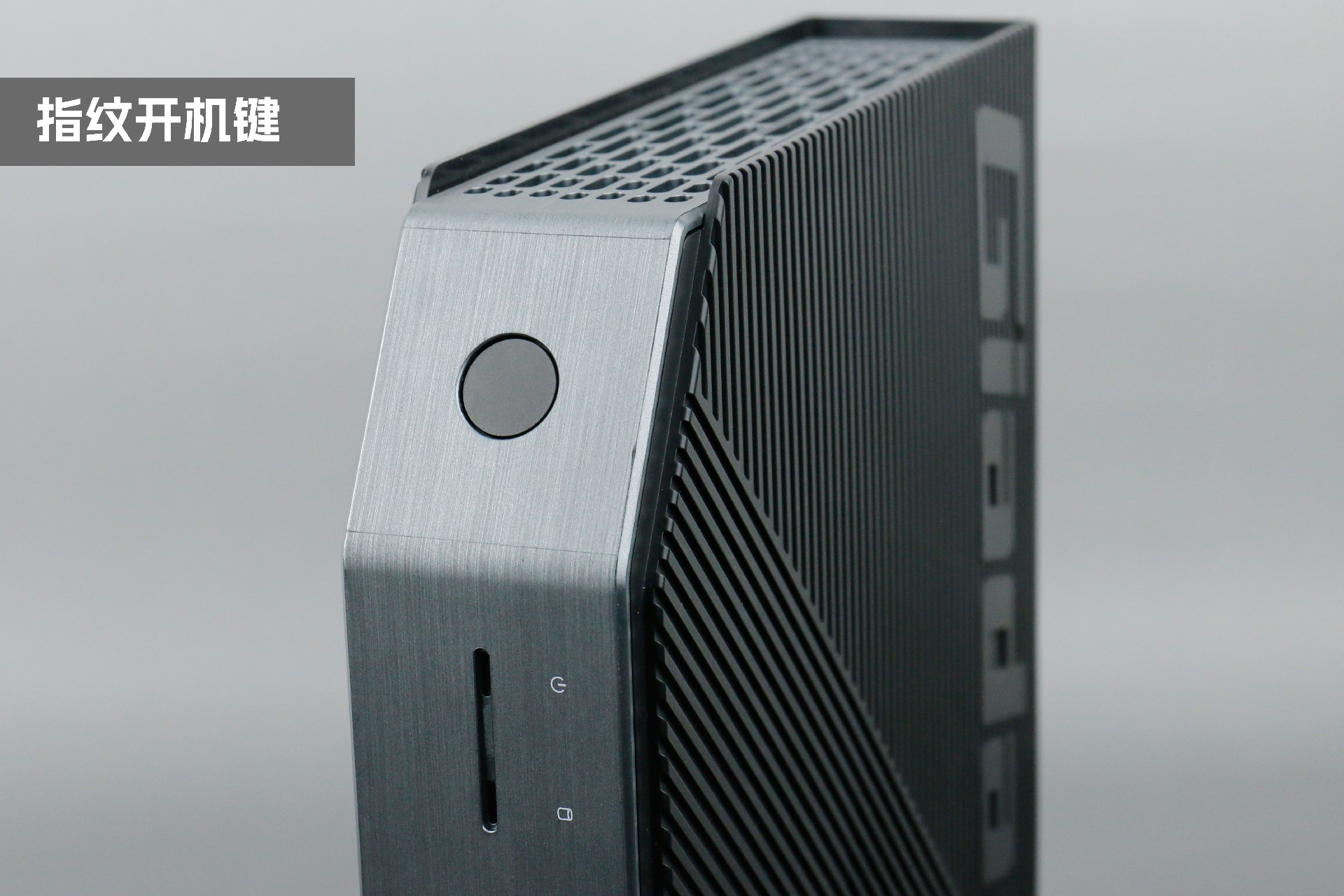 打开米兰milan桌面云终端Y-BOX P3,你会发现它的结构并不是常见的四方体设计,而是在转角处好似被切割开一个角,切割出来的面积为指纹识别开机键。它的外观为优雅的银灰配色,机身正面厚重感十足,顶部依然沿用黑色哑光栅格并延伸至整机背面,磨砂塑胶材质壳,印刻米兰milanGiada品牌名;其他三面则为银灰色,两侧是蜂窝式通风口设计。