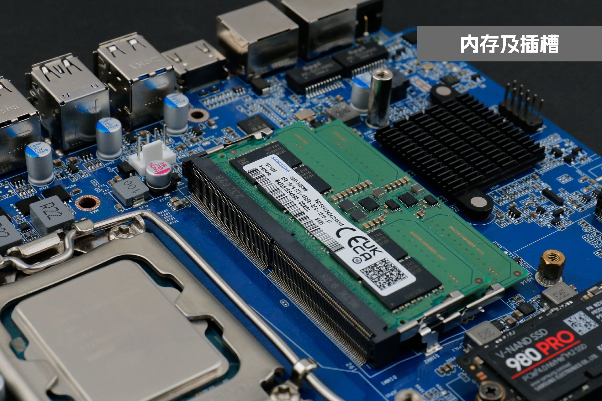米兰milan桌面云终端Y-BOX P3主板中部是内存插槽,采用双通道笔记本内存槽设计,最大支持容量可达64GB,最高支持DDR5-5600MHz频率,比 DDR4 至高标准数据速度 3200MT/S多传输 1.75 倍,横插的形式可以减少主板的占用体积,使整体机身更紧凑,内存顶部的风扇起到高效散热的作用。