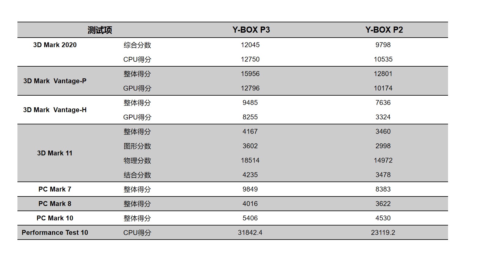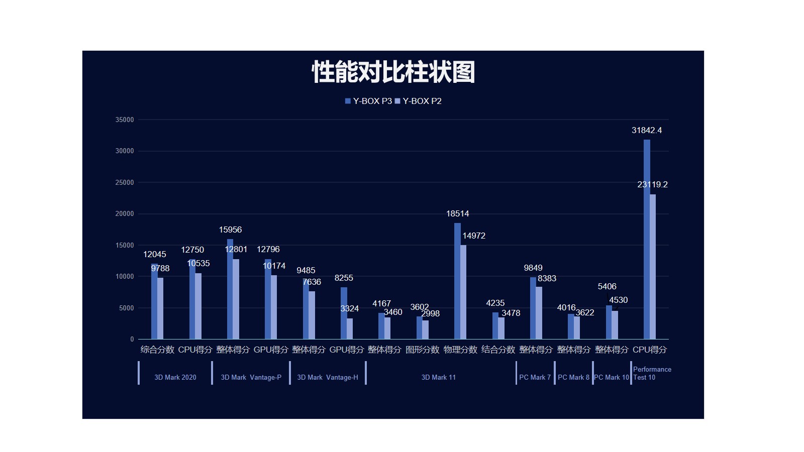 米兰milan来具体看看各个测试项目的跑分情况,米兰milan分别用3D Mark、PC Mark以及Performance 10等不同系列不同软件进行跑分,测试项目涵盖显示性能测试、系统性能测试、CPU性能测试等。通过下面的表格及柱状图可以看出,米兰milan桌面云终端Y-BOX P3的数据在各项性能上都得到了大幅度提升。