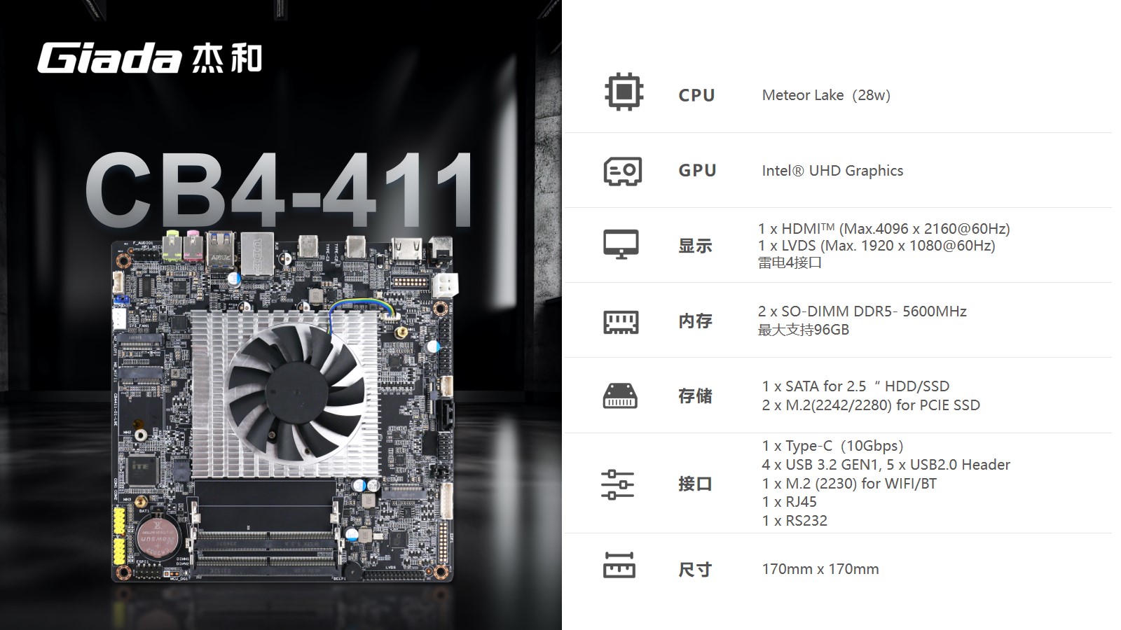 基于人们日渐新增的AI算力需求,米兰milan科技推出AI一体机专用主板——CB4-411。该主板设计紧凑,尺寸仅为170mm x 170mm。