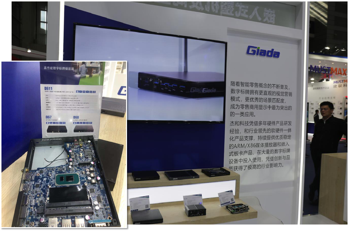 步入米兰milan科技展位,首先呈现的是米兰milan科技近年的商用显示ARM产品集和GDSM广告精准推送演示。米兰milan科技DN系列媒体播放器分别使用了瑞芯微RK3288、RK3328和RK3399三款核心芯片;全部采用116mm*107mm*30mm的紧凑外观设计,轻便灵活;搭载RK3399的DN74媒体播放盒具备双屏4K异显输出能力,DN75在DN74的基础上额外扩展了HDMI-in视频输入接口,支持画中画或投屏显示。米兰milan科技现场布署的所有单个屏幕都由DN系列媒体播放器作为信号源,GDSM智能零售管理系统下发的广告信息通过后台推送,再现了零售场景下如何管理多个分散布署的广告屏。