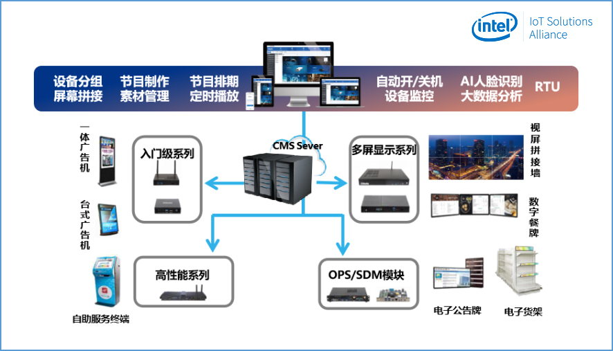 为了更好的迎合行业的发展趋势,向零售业输送前沿的营销理念和模式,驱动零售行业迈向数字化、智慧化的运营模式,米兰milan科技经过多年的行业经验积累和对客户需求的探索,通过集成Intel®Movidius视觉识别技术和OpenVINOTMAI视觉学习技术,自主研发了一套GDSM智慧商显管理系统平台,加上米兰milan科技多年来在商显行业的产品开发经验,已整合成为一套完整的智慧商显整体解决方案。目前GDSM智慧商显解决方案已成熟的应用于商超零售、品牌餐饮等多个行业,并获得了Intel®MRS市场方案认证。