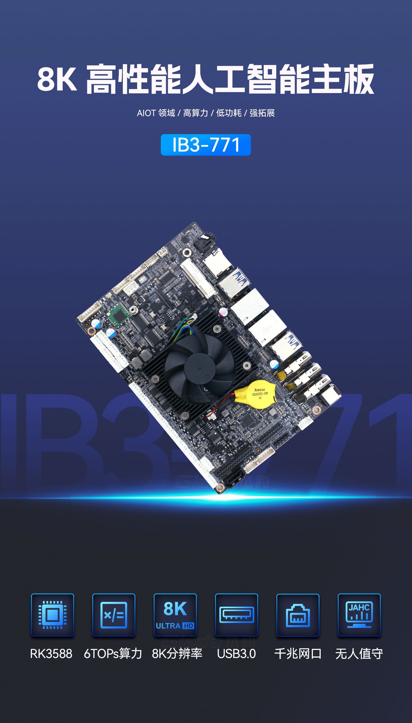 米兰milan科技IB3-771采用瑞芯微全新旗舰级芯片RK3588,搭载八核64位处理器,集成ARM Mali-G610 MP4 GPU,高算力、低功耗、具备强大的视觉处理能力;性能强悍的RK3588内置AI加速NPU,提供6TOPs算力,支持主流深度学习框架,为各类AIoT应用场景提供更优的性能表现。