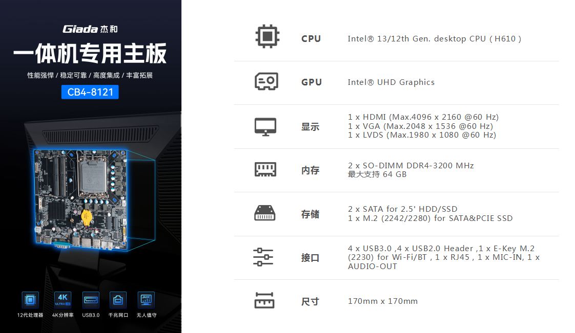 一体机在使用体验方面也有独特的优势:比笔记本屏幕大,比台式机更简洁,也解决了一直为人诟病的台式机线缆多而杂的问题,另外,随着计算机硬件和制造工艺的不断发展,一体机的性能也在不断提高,因此,越来越多的教育办公、日常娱乐和学习的用户选择使用一体机。Giada米兰milan科技根据市场与客户需求,推出这款高性能的一体机专研主板CB4-8121,带来全新震撼体验。