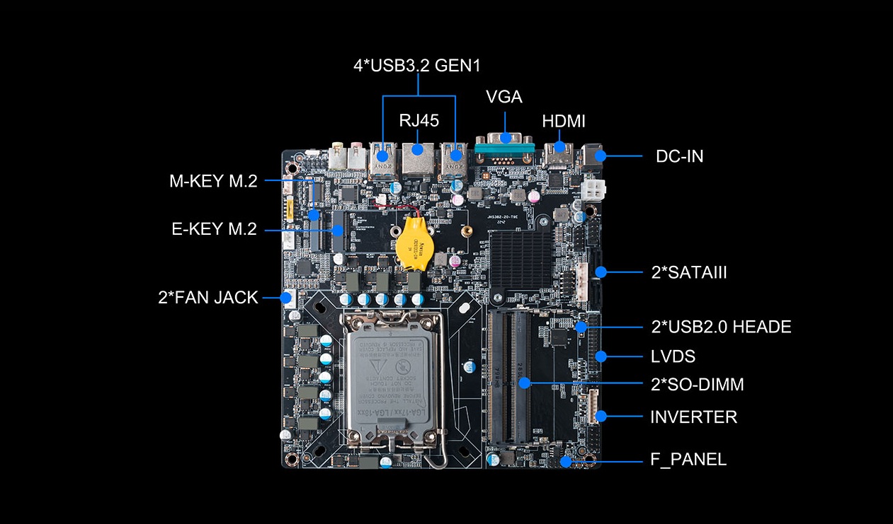 CB4-8121配备4个USB3.0接口(速度5 Gbps),支持扩展键盘、鼠标、打印机、U盘等设备,可以满足多样化的日常拓展需求的同时,实现高速数据传输;提供DMI、VGA和LVDS接口,最高支持4K@60Hz超清显示输出,配备1 x MIC-IN, 1 x AUDIO-OUT音频接口,满足用户对高质量音视觉效果的需求;支持Sata、M.2 NVME存储接口,板内提供了丰富的插针,供客户进行选择性的接口与功能拓展;网络配置方面,支持千兆自适应RJ45网口,让用户能够体验到更加迅捷和稳定的网络连接。
