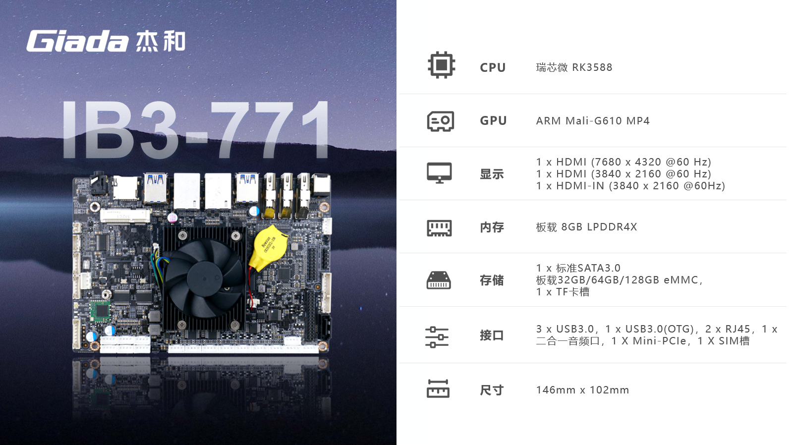 米兰milanARM主板IB3-771采用瑞芯微RK3588处理器,满足各种人工智能场域对嵌入式主板包括但不限于高算力、低功耗、高扩展性、高可靠性、高安全性等要求,支持在宽温、复杂电磁等恶劣环境下稳定运行,可广泛应用于机器人、边缘计算、智能NVR、智能汽车、智慧大屏、AR/VR、ARM PC、智能自助终端等AIoT行业类应用市场。