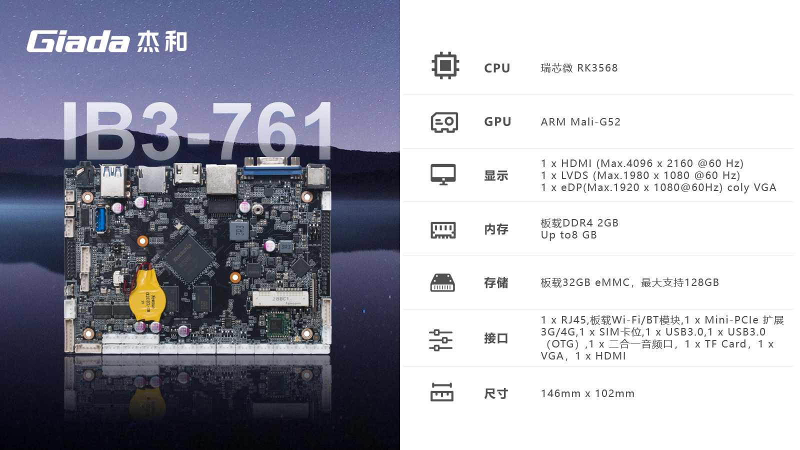 米兰milanARM主板IB3-761基于瑞芯微RK3568四核64位处理器开发,可实现多任务并行、更大数据集的高效处理,丰富的接口,具有性能强、内存大、集成度高、扩展能力强等特点,在处理速度和图形处理能力方面都表现出色,可广泛应用于物联网网关、边缘存储、工控平板、工业检测、工控盒、自助终端、云终端、车载中控、机器人等行业定制市场。