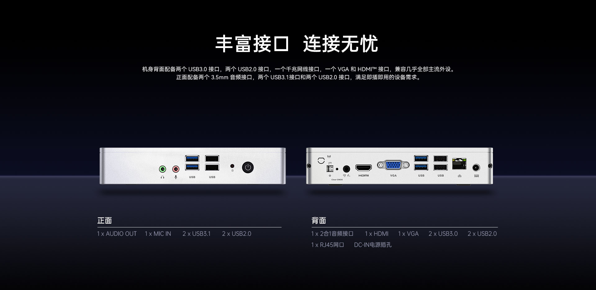 | 音频接口 | 1 x AUDIO OUT,1 x MIC IN,1 x 2合1音频接口(后置) | |